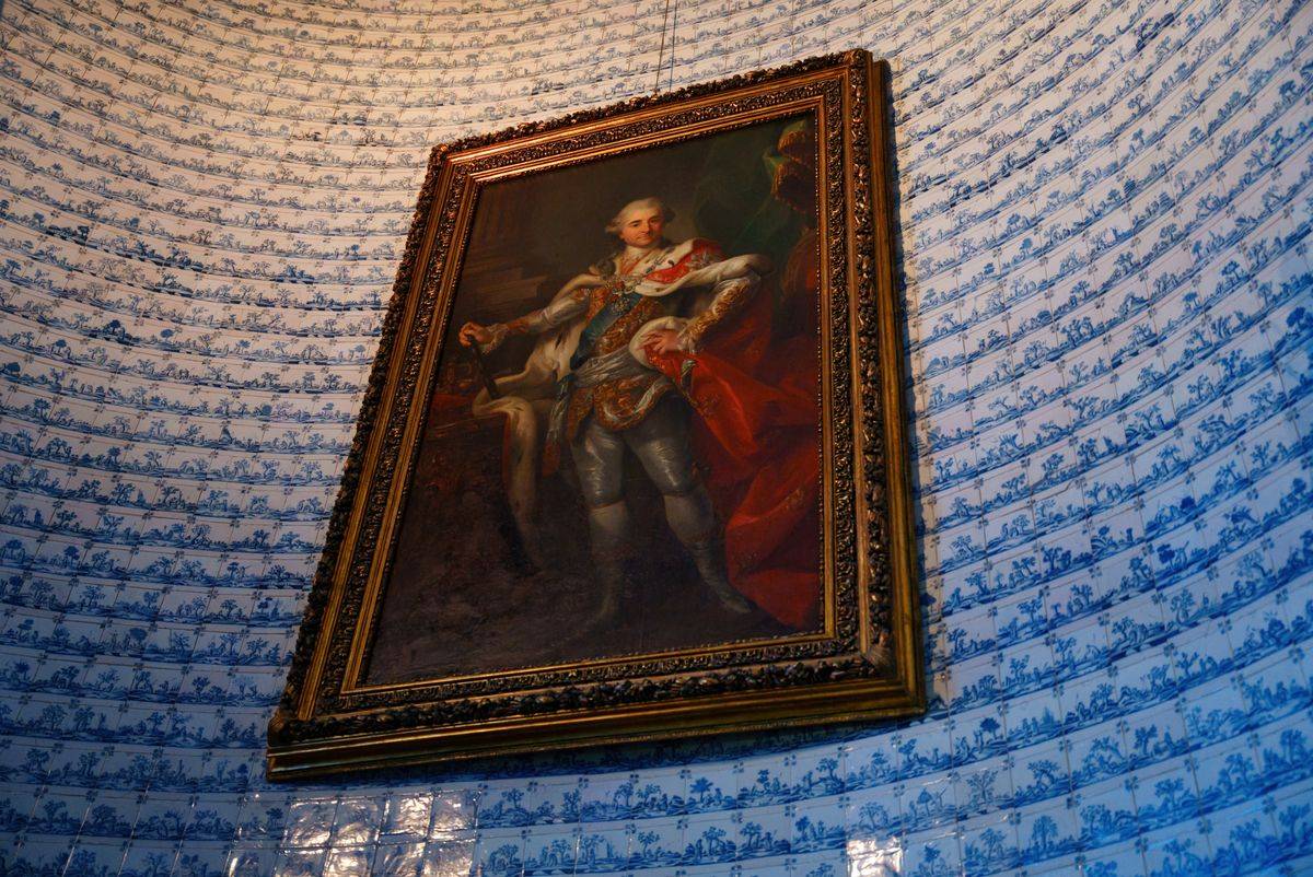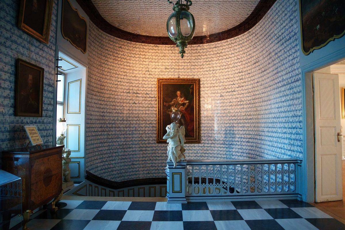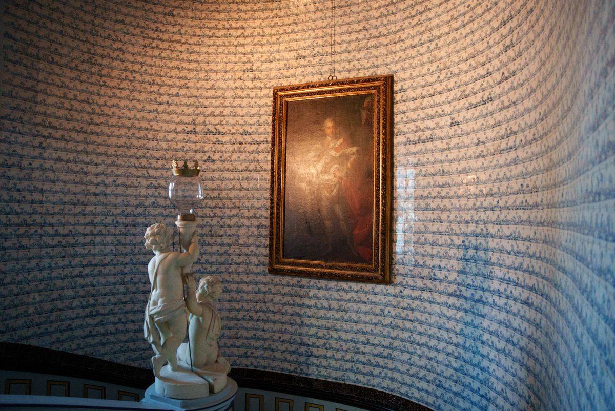 Wnętrza Nieborowa kryją też prawdziwe perły sztuki. Jednym z najbardziej urzekających pomieszczeń jest główna klatka schodowa – przestrzeń o niezwykłej urodzie i wyjątkowej historii. Wybudowana przez Michała Kazimierza Ogińskiego w latach 1766–1768, stanowi przykład mistrzowskiego połączenia architektury z dekoracją artystyczną. Jej ściany i podesty pokryto kobaltowymi płytkami ceramicznymi pochodzącymi z holenderskiej manufaktury w Harlingen, filii słynnego Delft. Kafelki, datowane na około 1700 rok, zdobią setki drobnych scenek z życia wsi holenderskie - malowane ręcznie błękitnym kobaltem na mlecznym tle. To niezwykły przykład XVIII-wiecznej mody na holenderską ceramikę, która w Polsce była symbolem luksusu i znajomości europejskich trendów.