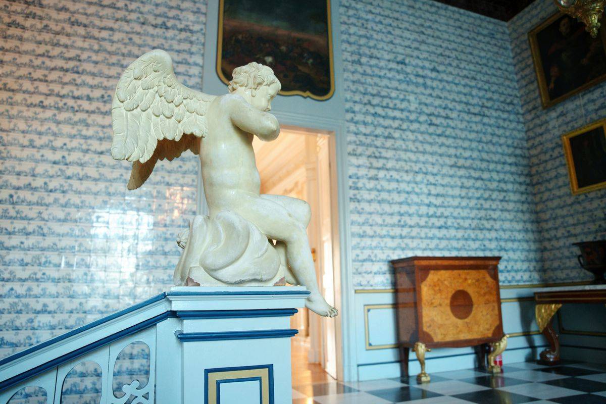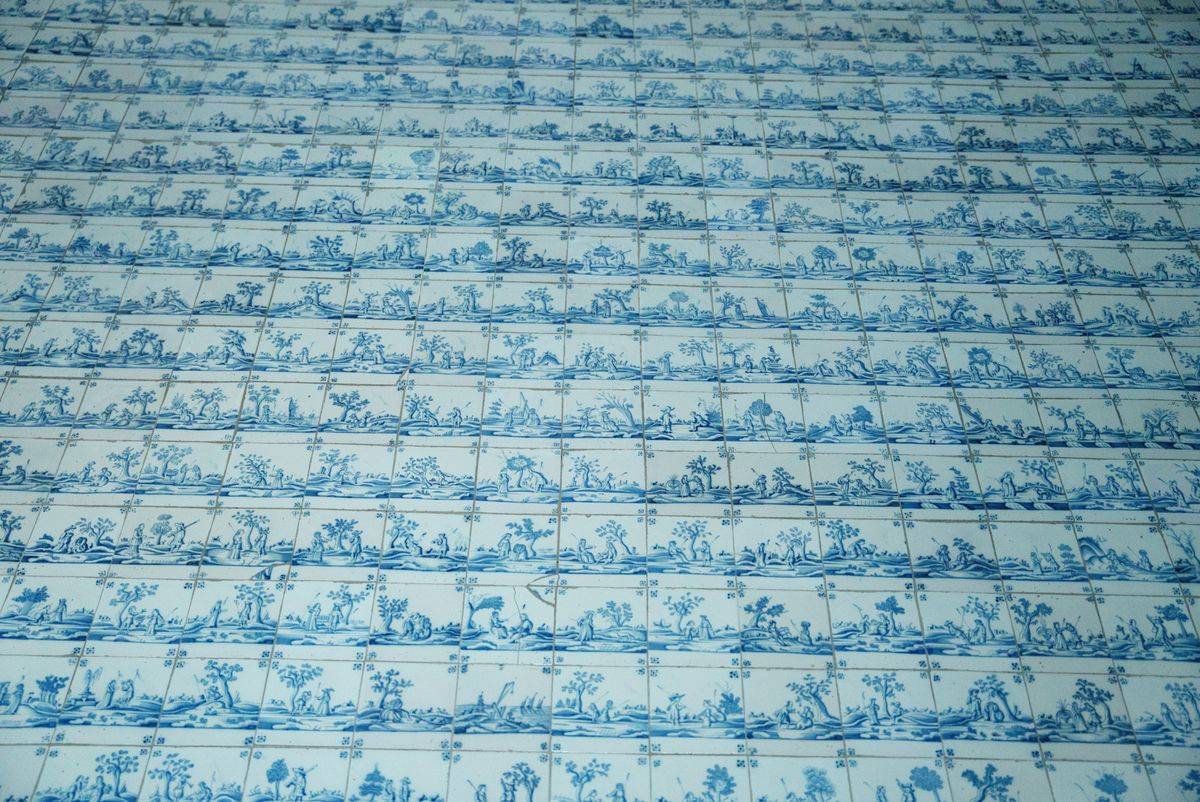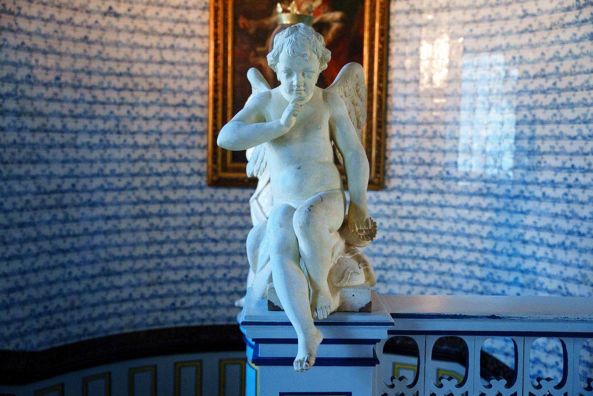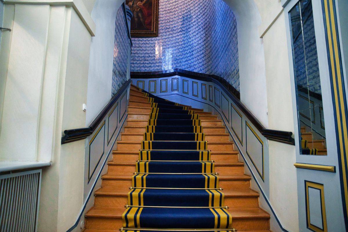 Wnętrza Nieborowa kryją też prawdziwe perły sztuki. Jednym z najbardziej urzekających pomieszczeń jest główna klatka schodowa – przestrzeń o niezwykłej urodzie i wyjątkowej historii. Wybudowana przez Michała Kazimierza Ogińskiego w latach 1766–1768, stanowi przykład mistrzowskiego połączenia architektury z dekoracją artystyczną. Jej ściany i podesty pokryto kobaltowymi płytkami ceramicznymi pochodzącymi z holenderskiej manufaktury w Harlingen, filii słynnego Delft. Kafelki, datowane na około 1700 rok, zdobią setki drobnych scenek z życia wsi holenderskie - malowane ręcznie błękitnym kobaltem na mlecznym tle. To niezwykły przykład XVIII-wiecznej mody na holenderską ceramikę, która w Polsce była symbolem luksusu i znajomości europejskich trendów.