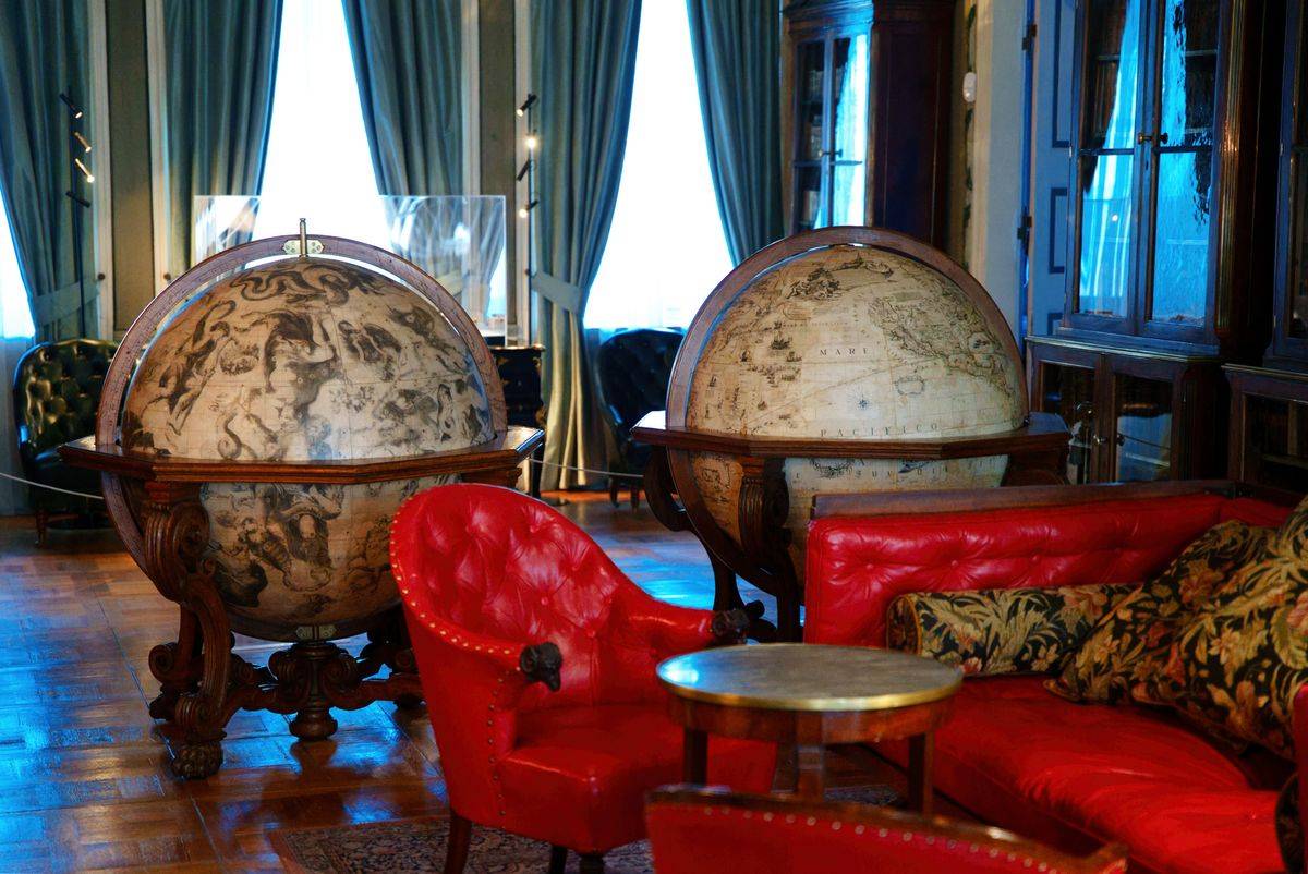 Jednym z najbardziej niezwykłych pomieszczeń pałacu jest biblioteka, założona przez Michała Hieronima Radziwiłła w drugiej połowie XVIII wieku. Gromadzi ona około dziesięciu tysięcy tomów w skórzanych oprawach, w tym cenne wydania dzieł starożytnych, encyklopedie, mapy i starodruki. Nad regałami górują dwa potężne globusy – ziemski i niebieski – wykonane w Wenecji przez Vinzenco Coronellego, z przeinaczeniem do Wersalu.Te imponujące instrumenty naukowe, o średnicy ponad metra, były niegdyś oznaką erudycji i prestiżu właścicieli, a dziś stanowią jedne z najcenniejszych obiektów tego typu w Polsce.